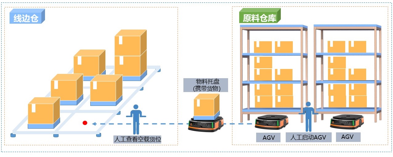 倉庫工人確認(rèn)線邊倉有空載貨位時(shí),需到生產(chǎn)線手動(dòng)開啟AGV完成搬運(yùn)任務(wù)。